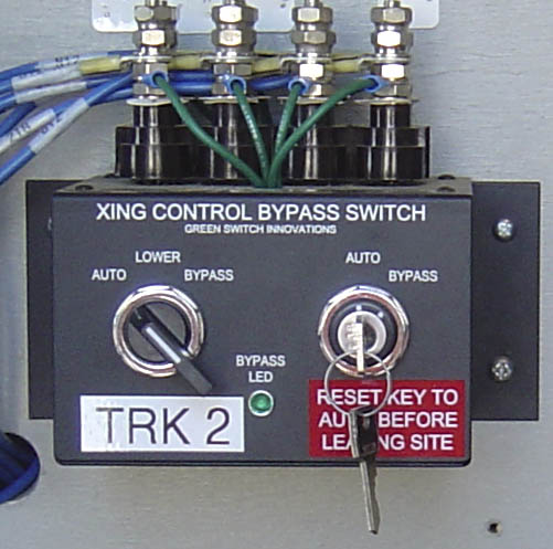 The XCBS is permanently wired into each crossing warning system, and can be configured with either a removable or non-removable bypass key. Simply connect the crossing control circuits to the designated terminals on the XCBS. The rotating "knife switch" on the left side of the XCBS allows the crossing warning system to be controlled for manual test purposes. To prevent unnecessary operation of the crossing warning system, insert the key and select "bypass", rotate the knife switch to "bypass" and the crossing is disabled. The non-removable bypass key adds an additional level of security for the Bypass function. Optional hookup can be made to the auxiallary terminals to include the activation of a strobe or event recorder input when the XCBS is placed in the "bypass" position. Keys can be color coded and/or numbered for assignment to individuals. Railroad jumper policies can be maintained; instead of keeping track of jumper numbers and locations where used, the maintainer keeps track of key numbers and the locations where used.